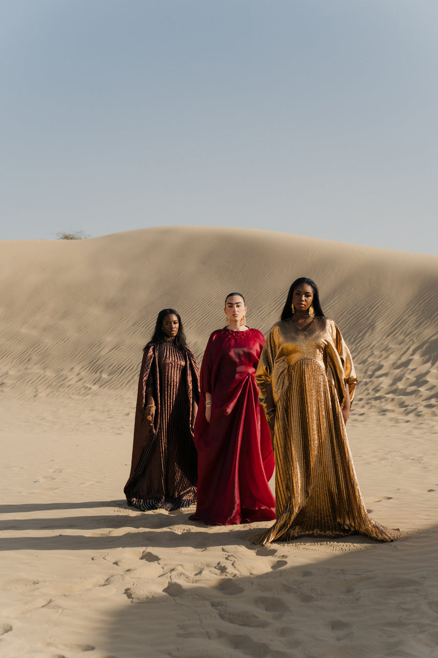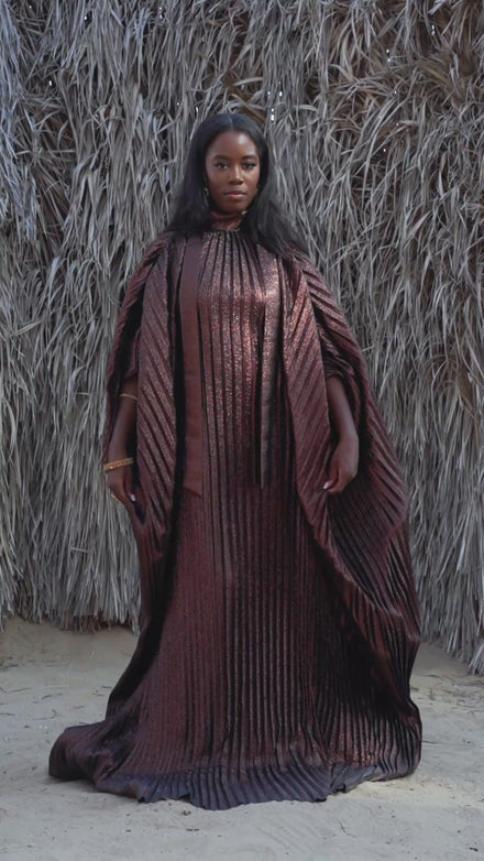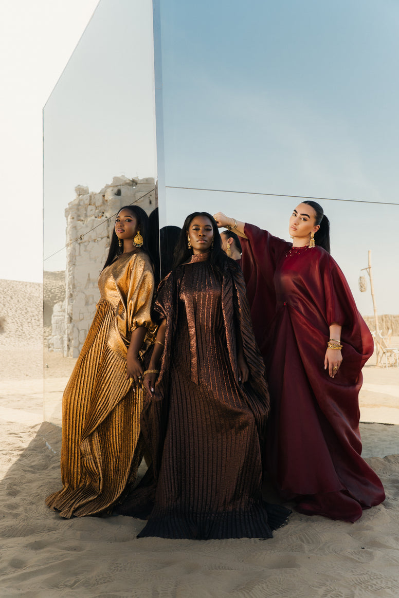 Handcrafted from luxurious fabric, the Jeloune Abaya features a high neckline with a delicate neck belt and an inner waist belt, creating a silhouette that is both striking and refined. Fully pleated from top to bottom, it moves with grace while exuding structure and presence.